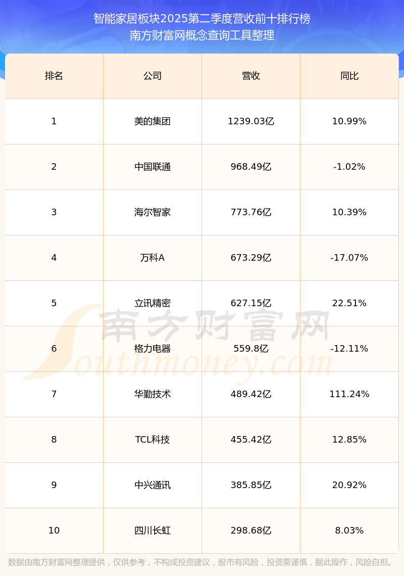 按照南方財富網概念查詢工具統計,該股所屬板塊為智能家居板塊,該板塊共有299只股票,惠達衛(wèi)浴2025第二季度營收在該板塊中排名為第152名,該板塊2025第二季度營收排名前十的股票如下表: