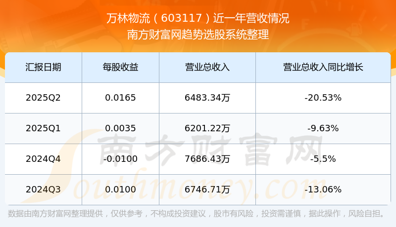 萬(wàn)林物流(603117)發(fā)布2025年第二季度財(cái)報(bào)。2025年第二季度萬(wàn)林物流實(shí)現(xiàn)營(yíng)業(yè)收入6483.34萬(wàn)元,同比增加-20.53元%,環(huán)比增加4.55%;凈利潤(rùn)為781.2萬(wàn)元,同比增長(zhǎng)-34.95%,環(huán)比增長(zhǎng)271.41%。