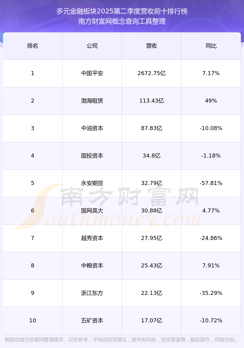 按照南方財(cái)富網(wǎng)概念查詢工具統(tǒng)計(jì),該股所屬板塊為多元金融板塊,該板塊共有35只股票,江蘇金租2025第二季度營(yíng)收在該板塊中排名為第12名,該板塊2025第二季度營(yíng)收排名前十的股票如下表: