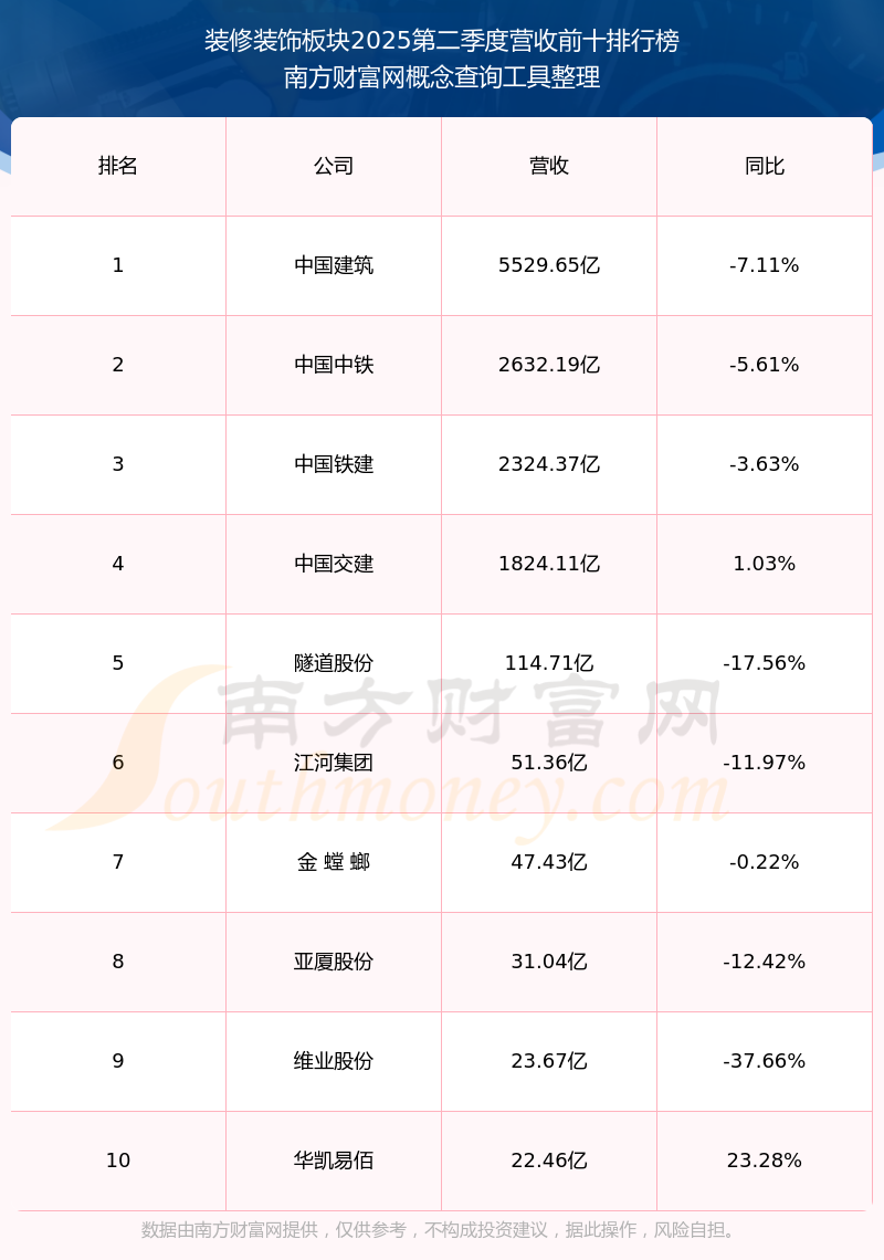 按照南方財(cái)富網(wǎng)概念查詢工具統(tǒng)計(jì),該股所屬板塊為裝修裝飾板塊,該板塊共有57只股票,全筑股份2025第二季度營(yíng)收在該板塊中排名為第37名,該板塊2025第二季度營(yíng)收排名前十的股票如下表: