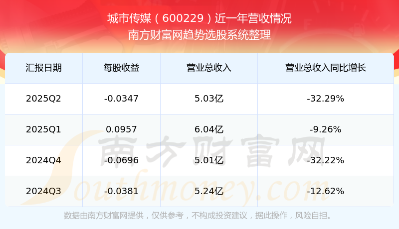 城市傳媒發(fā)布2025年第二季度財報。實現(xiàn)總營收5.03億元,同比增長-32.29%;扣非凈利潤同比增長-108.09%至-612.06萬元。