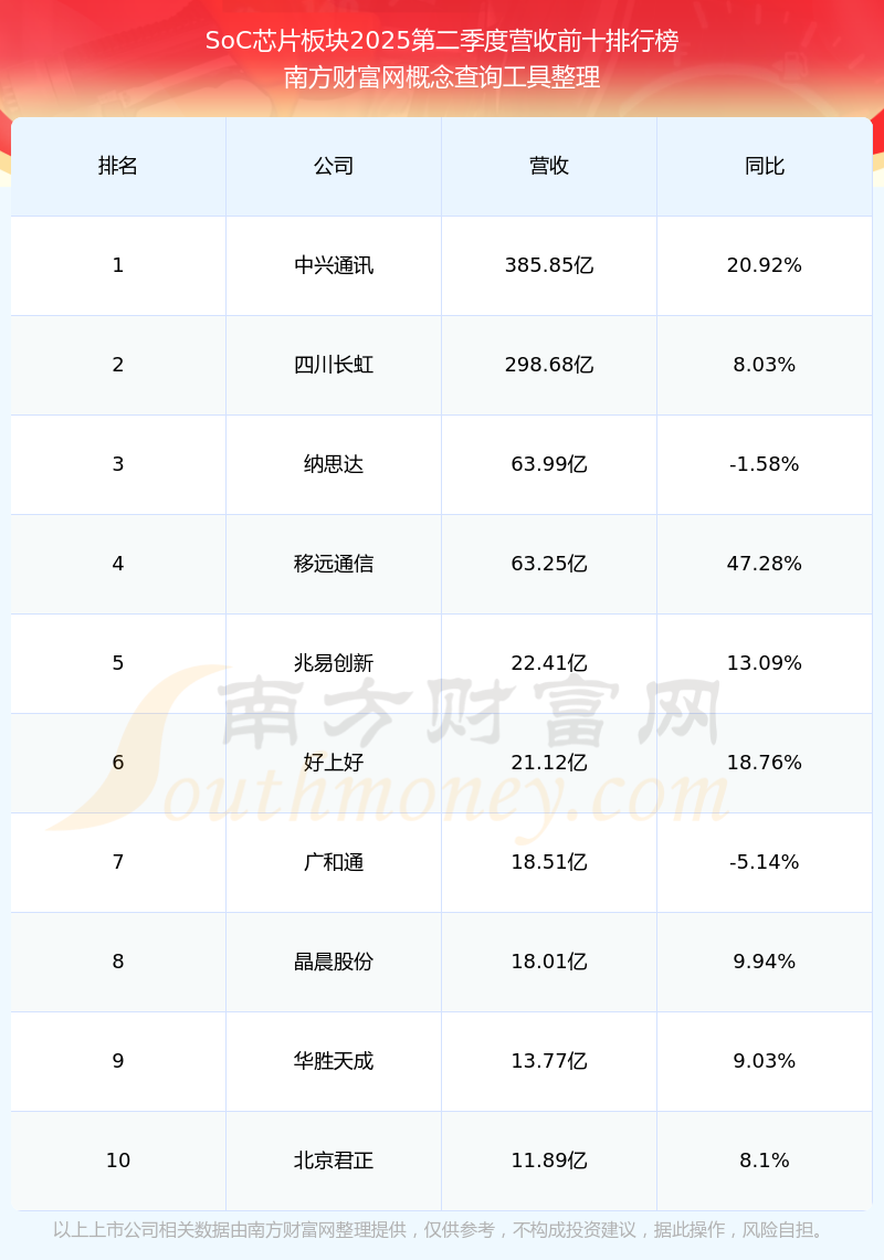 按照南方財富網(wǎng)概念查詢工具統(tǒng)計,該股所屬板塊為SoC芯片板塊,該板塊共有52只股票,晶華微2025第二季度營收在該板塊中排名為第52名,該板塊2025第二季度營收排名前十的股票如下表: