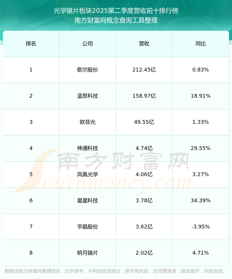 按照南方財(cái)富網(wǎng)概念查詢工具統(tǒng)計(jì),該股所屬板塊為光學(xué)鏡片板塊,該板塊共有8只股票,中潤(rùn)光學(xué)2025第二季度營(yíng)收在該板塊中排名為第8名,該板塊2025第二季度營(yíng)收排名前十的股票如下表: