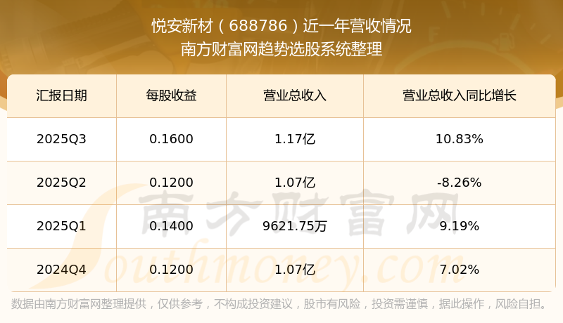 悅安新材發(fā)布2025年第三季度財報。實現(xiàn)總營收1.17億元,同比增長10.83%;扣非凈利潤同比增長21.16%至2245.39萬元。