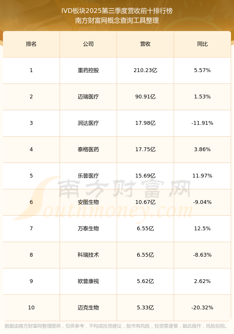 按照南方財(cái)富網(wǎng)概念查詢工具統(tǒng)計(jì),該股所屬板塊為IVD板塊,該板塊共有24只股票,塞力醫(yī)療2025第三季度營(yíng)收在該板塊中排名為第15名,該板塊2025第三季度營(yíng)收排名前十的股票如下表: