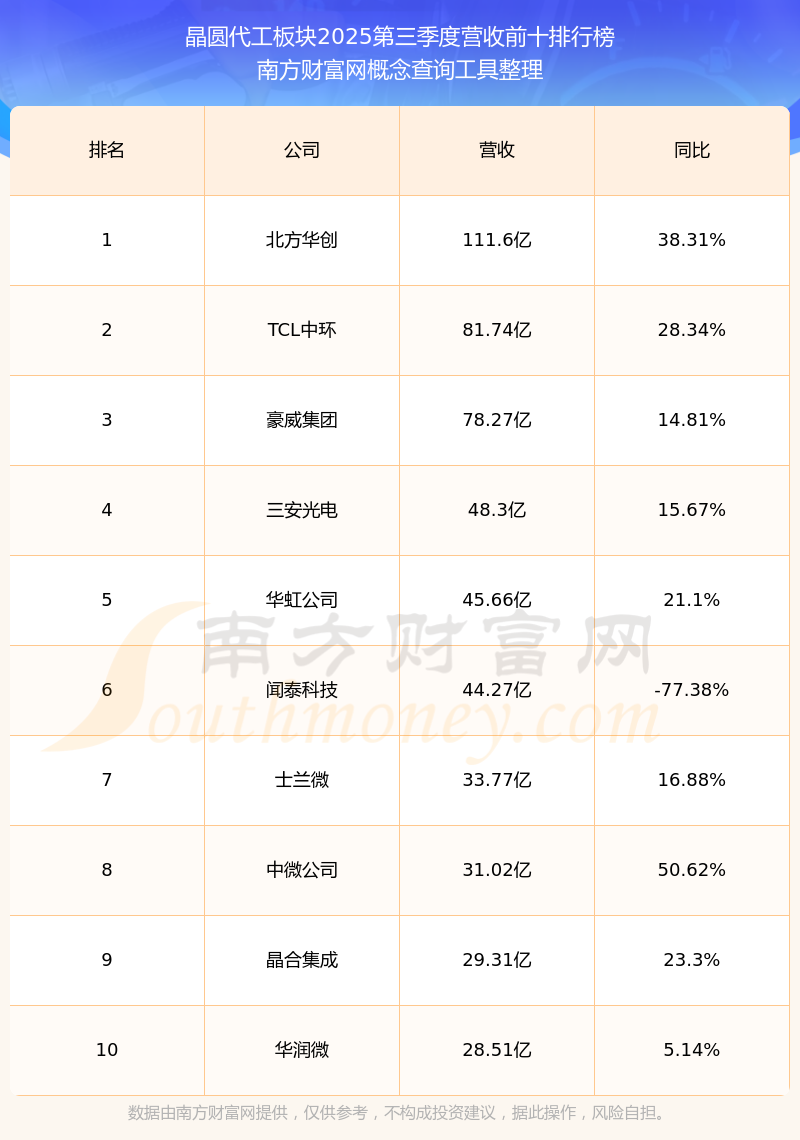 按照南方財(cái)富網(wǎng)概念查詢工具統(tǒng)計(jì),該股所屬板塊為晶圓代工板塊,該板塊共有35只股票,芯聯(lián)集成2025第三季度營(yíng)收在該板塊中排名為第12名,該板塊2025第三季度營(yíng)收排名前十的股票如下表: