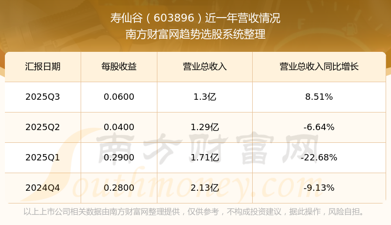 壽仙谷發(fā)布2025年第三季度財報。實現(xiàn)總營收1.3億元,同比增長8.51%;扣非凈利潤同比增長-22.09%至646.26萬元。