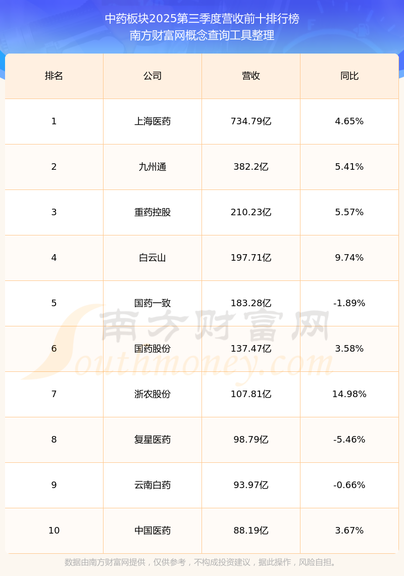 按照南方財富網(wǎng)概念查詢工具統(tǒng)計,該股所屬板塊為中藥板塊,該板塊共有160只股票,壽仙谷2025第三季度營收在該板塊中排名為第136名,該板塊2025第三季度營收排名前十的股票如下表: