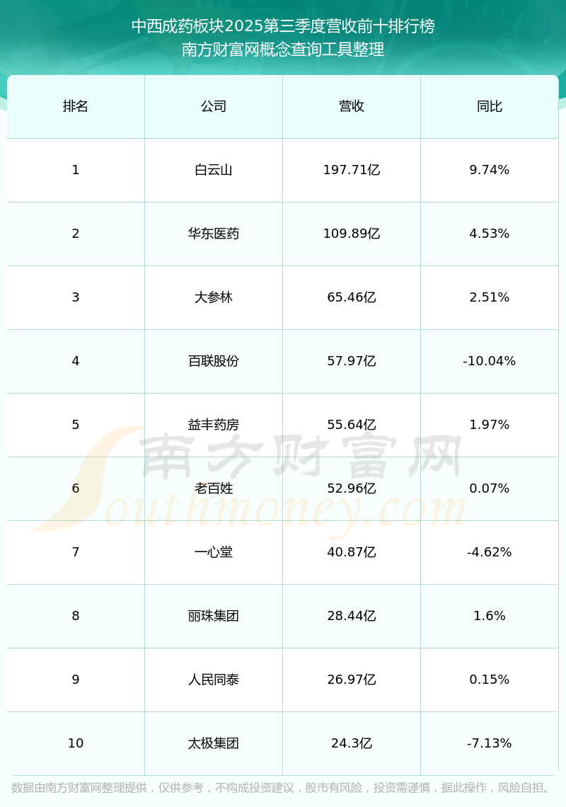 按照南方財富網(wǎng)概念查詢工具統(tǒng)計,該股所屬板塊為中西成藥板塊,該板塊共有13只股票,老百姓2025第三季度營收在該板塊中排名為第6名,該板塊2025第三季度營收排名前十的股票如下表: