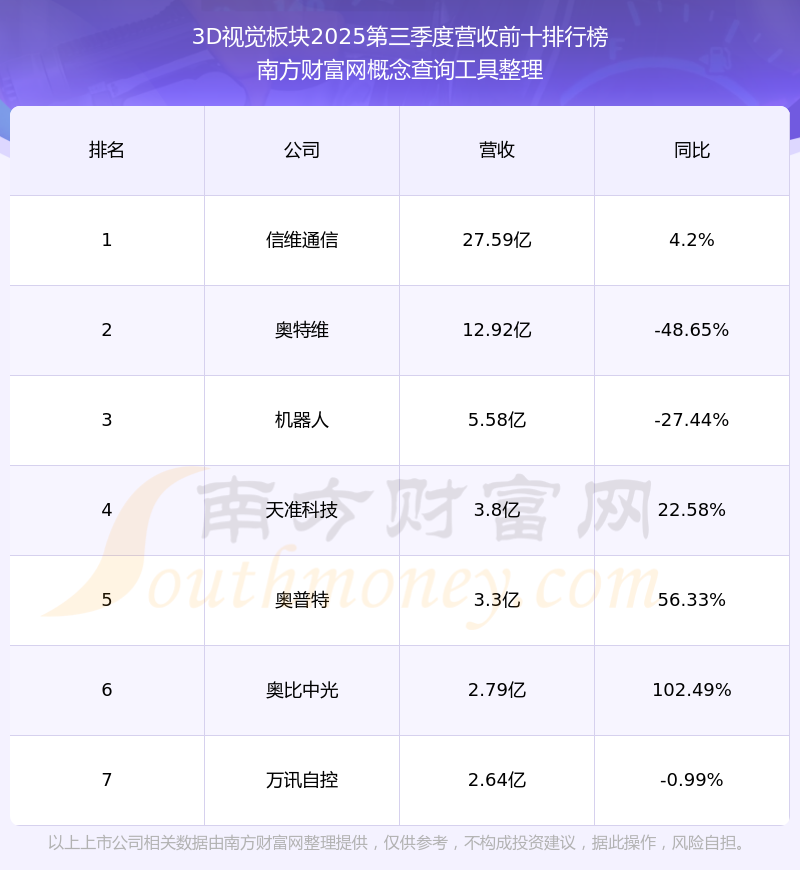 按照南方財富網(wǎng)概念查詢工具統(tǒng)計,該股所屬板塊為3D視覺板塊,該板塊共有7只股票,奧比中光2025第三季度營收在該板塊中排名為第6名,該板塊2025第三季度營收排名前十的股票如下表: