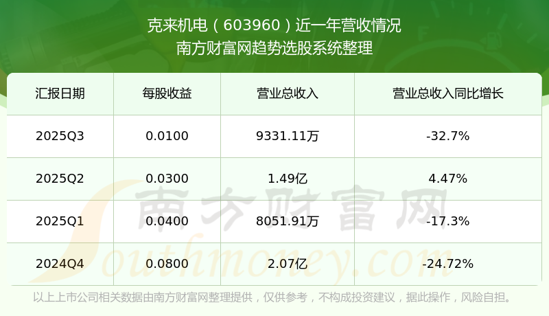 一、克來機(jī)電(603960)股票營收情況