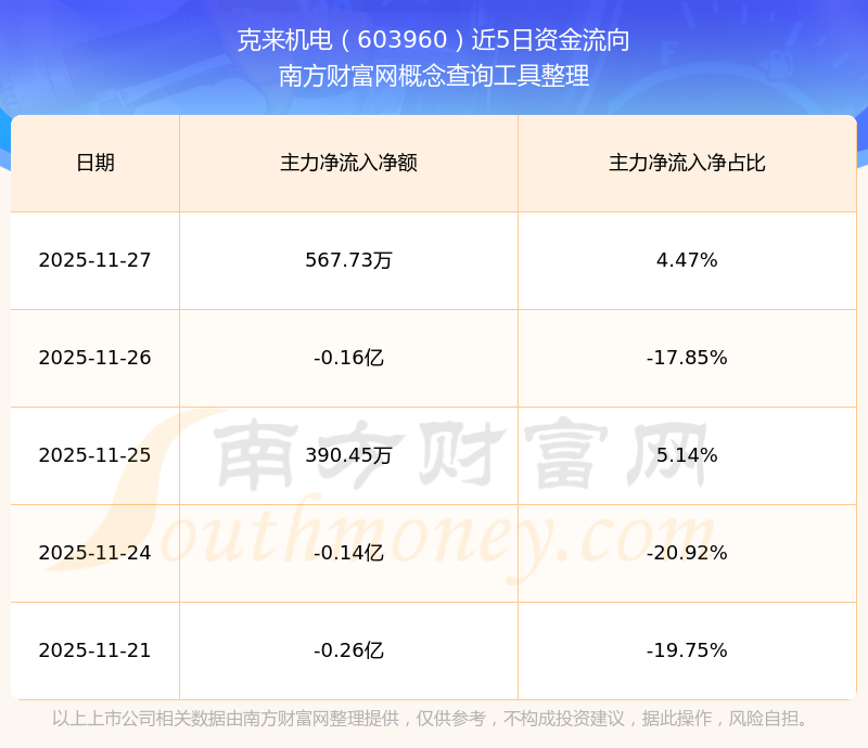 二、克來機(jī)電(603960)近期盤面、資金面情況