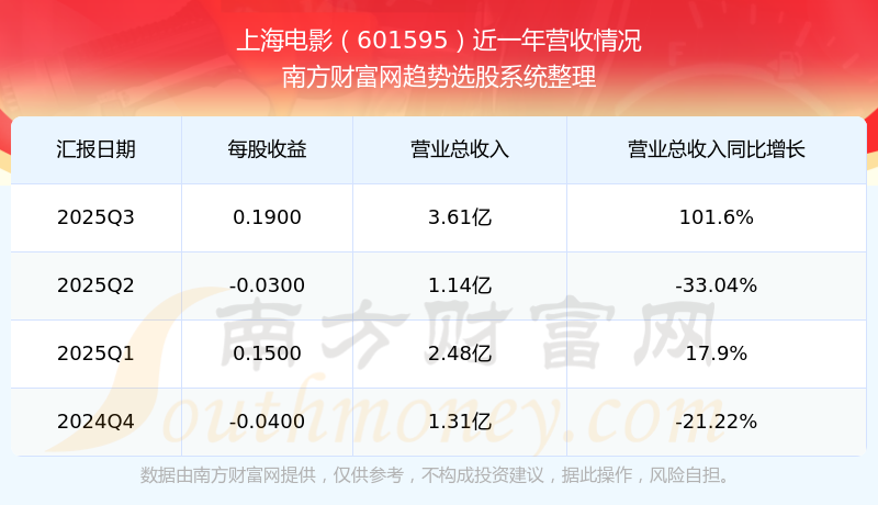 上海電影2025年第三季度顯示,公司主營(yíng)收入3.61億元,同比101.6%;歸母凈利潤(rùn)8566.58萬(wàn)元,同比123.51%;扣非凈利潤(rùn)7986.92萬(wàn)元,同比10679.37%。