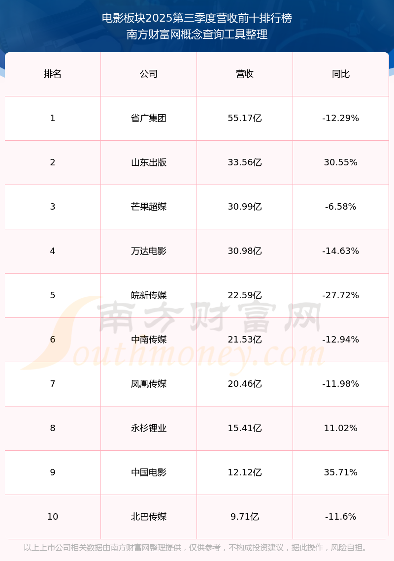 按照南方財(cái)富網(wǎng)概念查詢工具統(tǒng)計(jì),該股所屬板塊為電影板塊,該板塊共有44只股票,上海電影2025第三季度營(yíng)收在該板塊中排名為第20名,該板塊2025第三季度營(yíng)收排名前十的股票如下表: