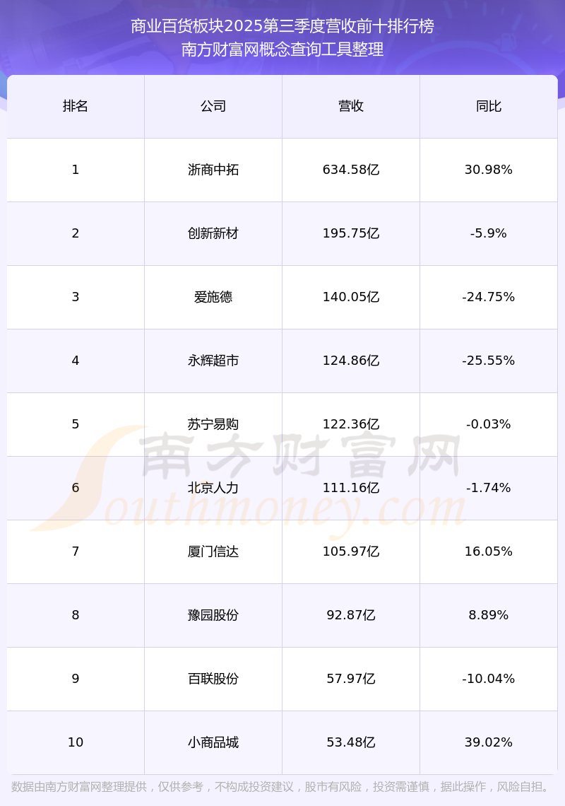 按照南方財富網(wǎng)概念查詢工具統(tǒng)計,該股所屬板塊為商業(yè)百貨板塊,該板塊共有74只股票,文峰股份2025第三季度營收在該板塊中排名為第52名,該板塊2025第三季度營收排名前十的股票如下表: