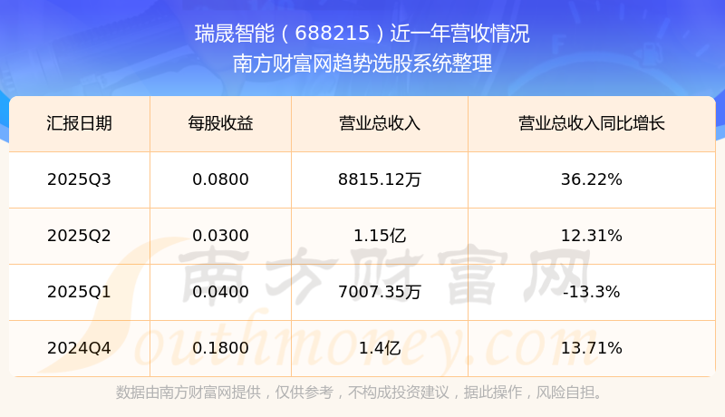 瑞晟智能(688215)披露2025年第三季度報告,報告期實現(xiàn)營收8815.12萬元,同比36.22%;歸母凈利潤512.43萬元,同比208.2%;扣非凈利潤507.55萬元,同比302.2%;基本每股收益0.08元。