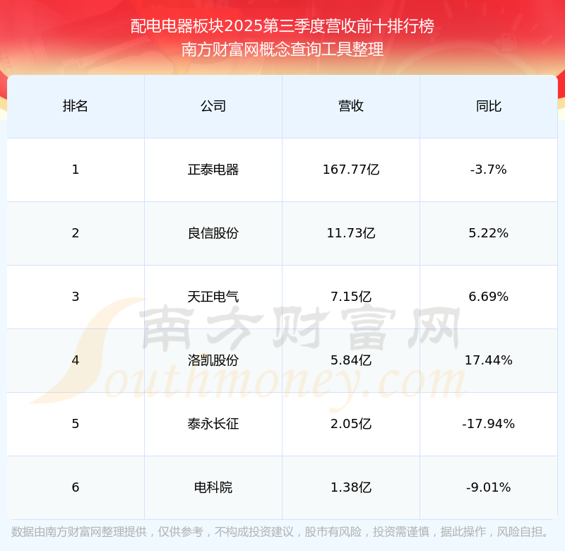 按照南方財(cái)富網(wǎng)概念查詢工具統(tǒng)計(jì),該股所屬板塊為配電電器板塊,該板塊共有6只股票,天正電氣2025第三季度營(yíng)收在該板塊中排名為第3名,該板塊2025第三季度營(yíng)收排名前十的股票如下表: