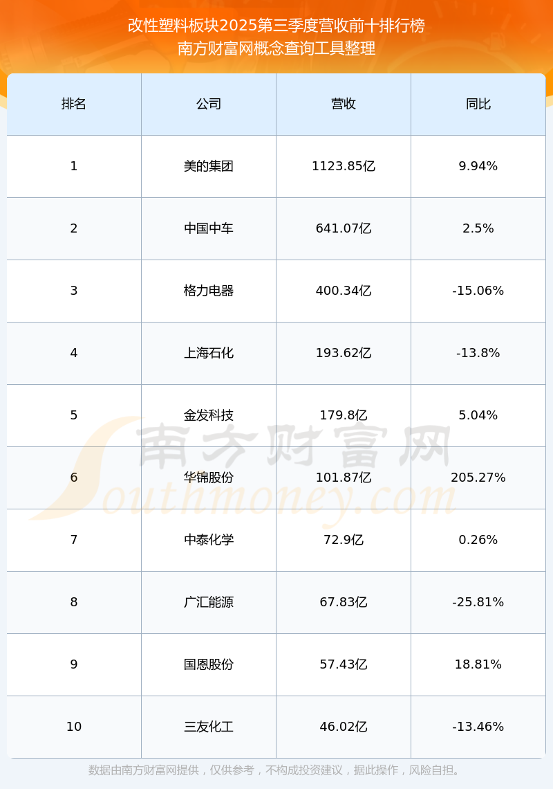 按照南方財富網(wǎng)概念查詢工具統(tǒng)計,該股所屬板塊為改性塑料板塊,該板塊共有55只股票,會通股份2025第三季度營收在該板塊中排名為第16名,該板塊2025第三季度營收排名前十的股票如下表: