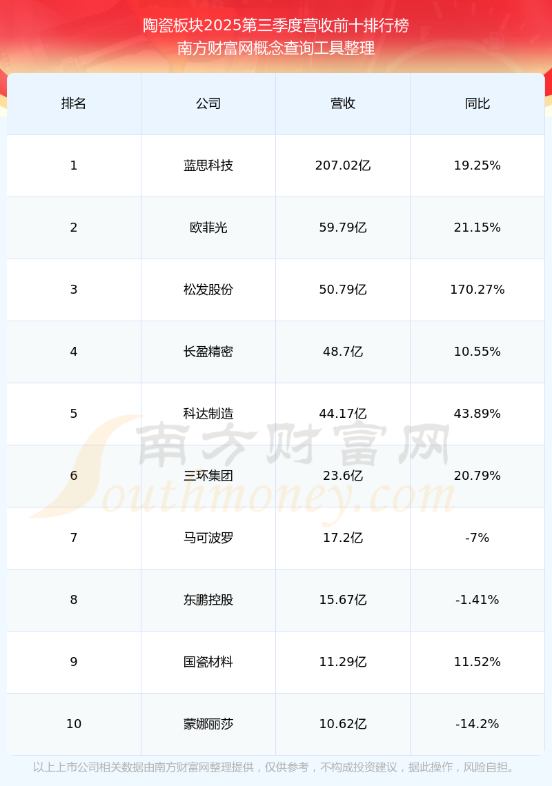 按照南方財(cái)富網(wǎng)概念查詢工具統(tǒng)計(jì),該股所屬板塊為陶瓷板塊,該板塊共有27只股票,四通股份2025第三季度營收在該板塊中排名為第27名,該板塊2025第三季度營收排名前十的股票如下表: