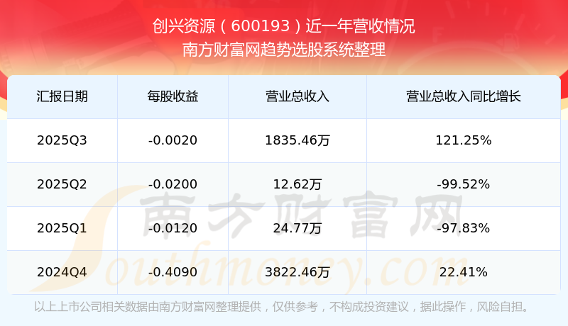 于2025年第三季度,創(chuàng)興資源披露了其業(yè)績表現(xiàn),其中主營業(yè)務(wù)收入1835.46萬元,相較于去年同期121.25%。此外,公司歸屬于母公司的凈利潤為-77.38萬元,同比增長了93.92%。在扣除所有非經(jīng)常性損益后,凈利潤-1405.81萬元,同比增長-6.04%。
