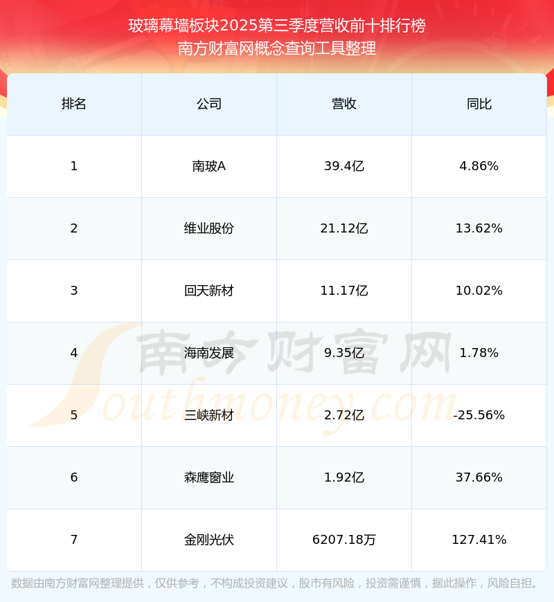 按照南方財富網(wǎng)概念查詢工具統(tǒng)計,該股所屬板塊為玻璃幕墻板塊,該板塊共有7只股票,創(chuàng)興資源2025第三季度營收在該板塊中排名為第7名,該板塊2025第三季度營收排名前十的股票如下表: