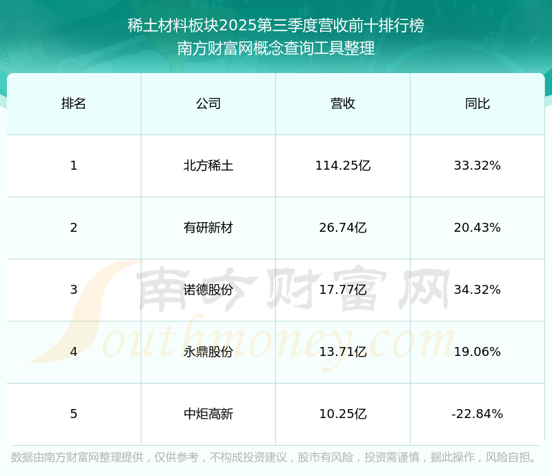 按照南方財富網(wǎng)概念查詢工具統(tǒng)計,該股所屬板塊為稀土材料板塊,該板塊共有5只股票,有研新材2025第三季度營收在該板塊中排名為第2名,該板塊2025第三季度營收排名前十的股票如下表: