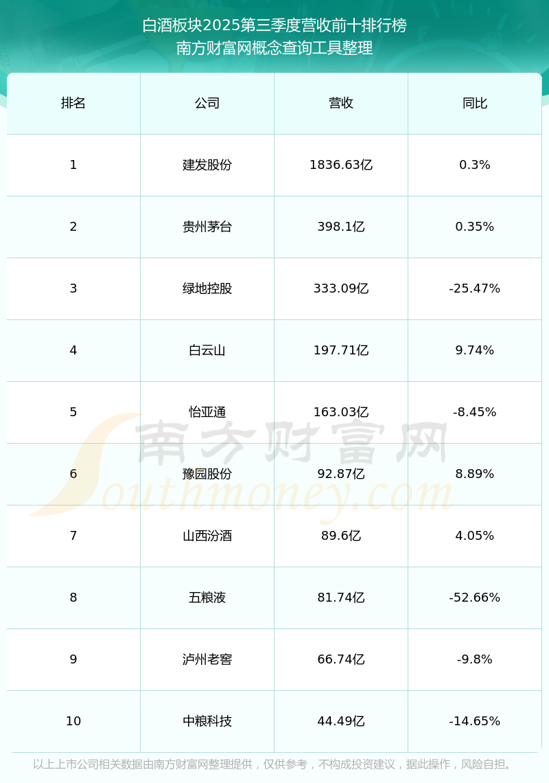 按照南方財富網(wǎng)概念查詢工具統(tǒng)計,該股所屬板塊為白酒板塊,該板塊共有59只股票,迎駕貢酒2025第三季度營收在該板塊中排名為第17名,該板塊2025第三季度營收排名前十的股票如下表: