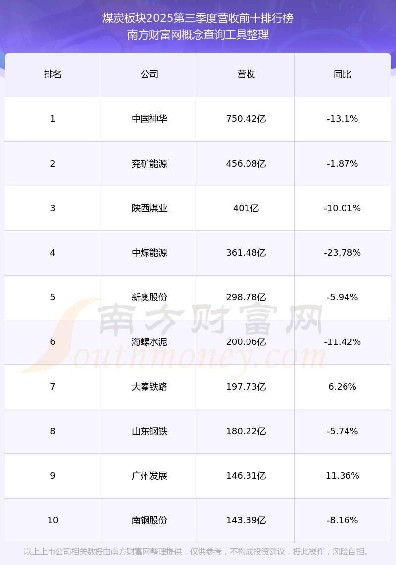 按照南方財富網(wǎng)概念查詢工具統(tǒng)計,該股所屬板塊為煤炭板塊,該板塊共有71只股票,兗礦能源2025第三季度營收在該板塊中排名為第2名,該板塊2025第三季度營收排名前十的股票如下表: