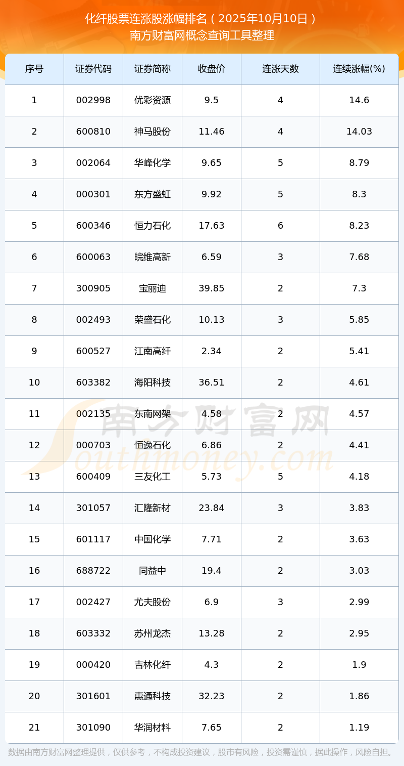 根據(jù)南方財富網(wǎng)概念查詢工具數(shù)據(jù)統(tǒng)計,截止2025年10月10日收盤,化纖股票共有21只個股實現(xiàn)連漲。其中連續(xù)漲幅較大的個股有優(yōu)彩資源、神馬股份、華峰化學等,連續(xù)漲幅分別為14.60%、14.03%、8.79%。
