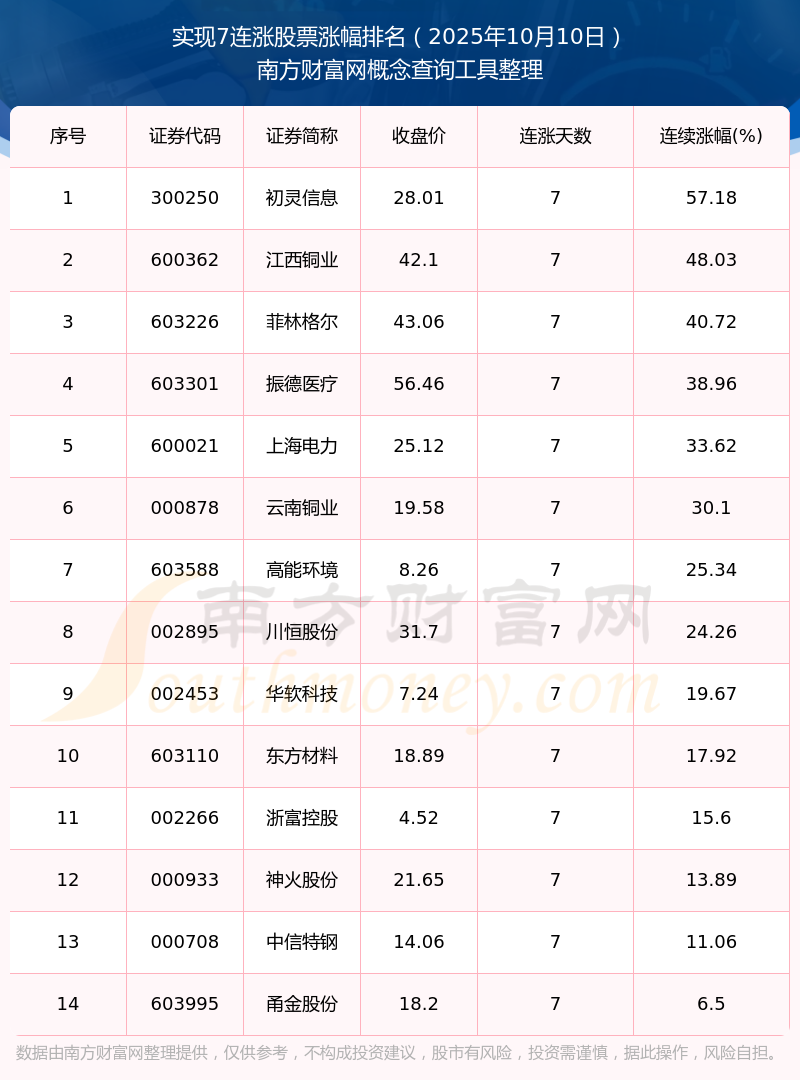 根據(jù)南方財富網(wǎng)概念查詢工具數(shù)據(jù)統(tǒng)計,截止2025年10月10日收盤,共有14只個股實現(xiàn)7天連漲。其中連續(xù)漲幅較大的個股有初靈信息、江西銅業(yè)、菲林格爾等,連續(xù)漲幅分別為57.18%、48.03%、40.72%。