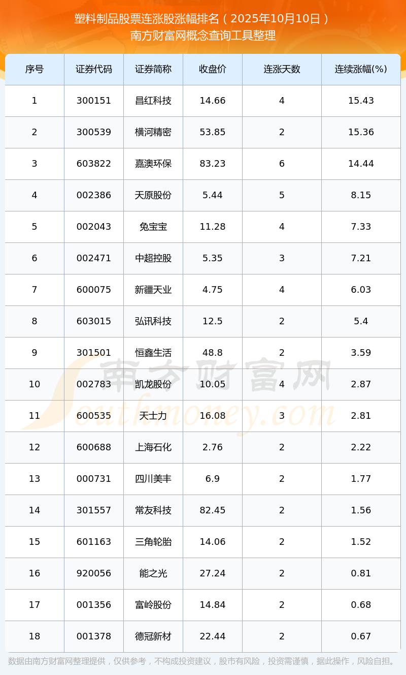 2025年10月10日塑料制品股票連漲股漲幅排名