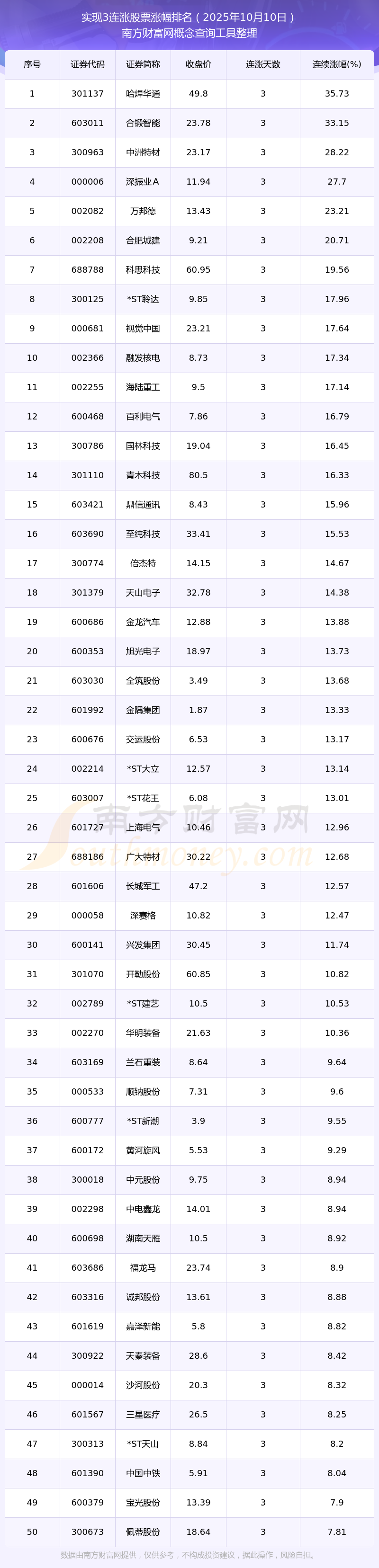 2025年10月10日實現(xiàn)3連漲股票漲幅排名