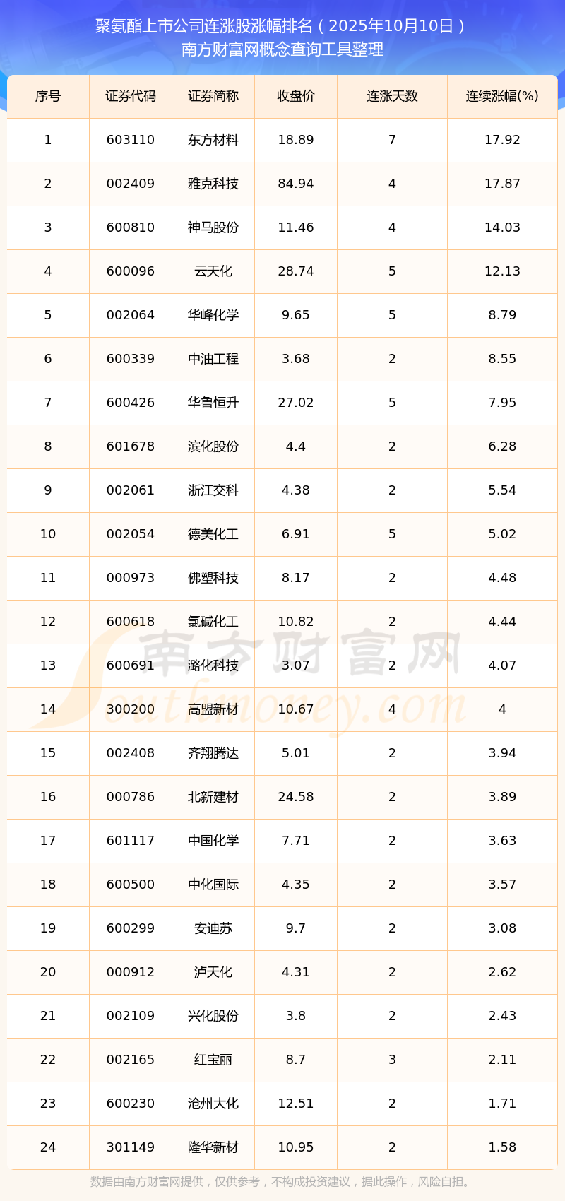 2025年10月10日聚氨酯上市公司連漲股漲幅排名