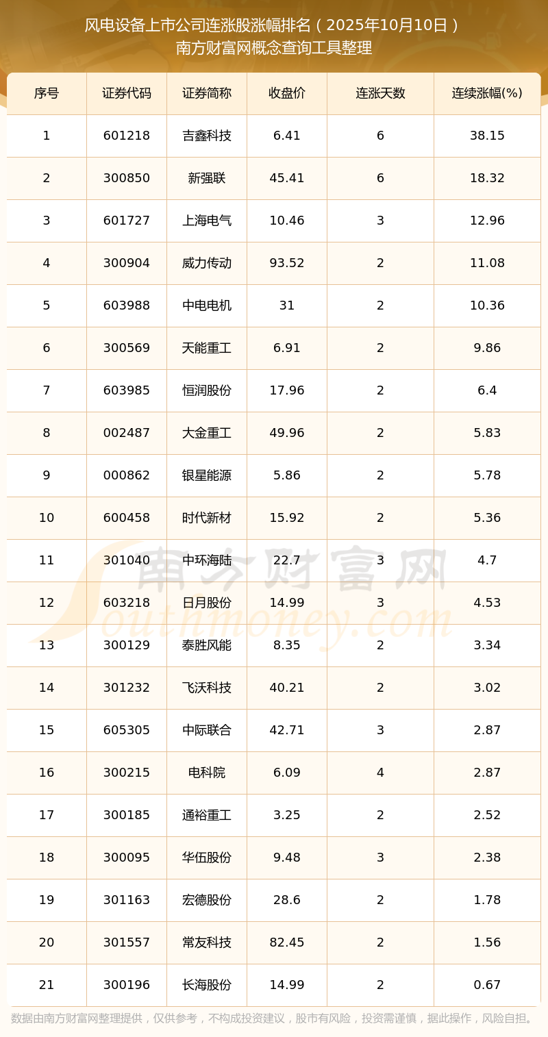 2025年10月10日風(fēng)電設(shè)備上市公司連漲股漲幅排名