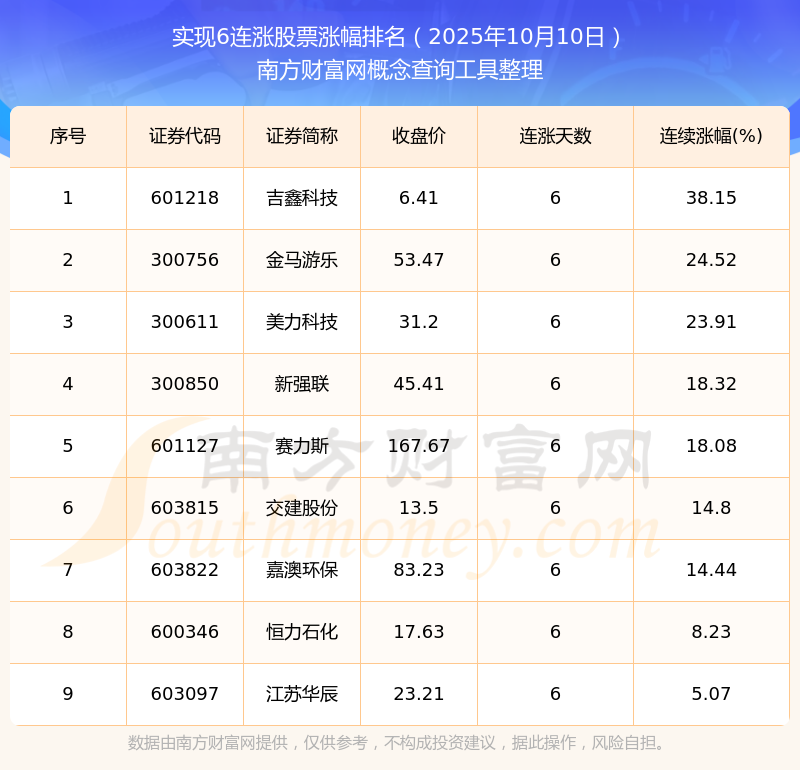 根據(jù)南方財富網(wǎng)概念查詢工具數(shù)據(jù)統(tǒng)計,截止2025年10月10日收盤,共有9只個股實現(xiàn)6天連漲。其中連續(xù)漲幅較大的個股有吉鑫科技、金馬游樂、美力科技等,連續(xù)漲幅分別為38.15%、24.52%、23.91%。