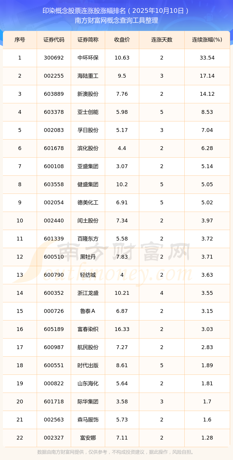 根據(jù)南方財富網(wǎng)概念查詢工具數(shù)據(jù)統(tǒng)計,截止2025年10月10日收盤,印染概念股票共有22只個股實現(xiàn)連漲。其中連續(xù)漲幅較大的個股有中環(huán)環(huán)保、海陸重工、新澳股份等,連續(xù)漲幅分別為33.54%、17.14%、14.12%。