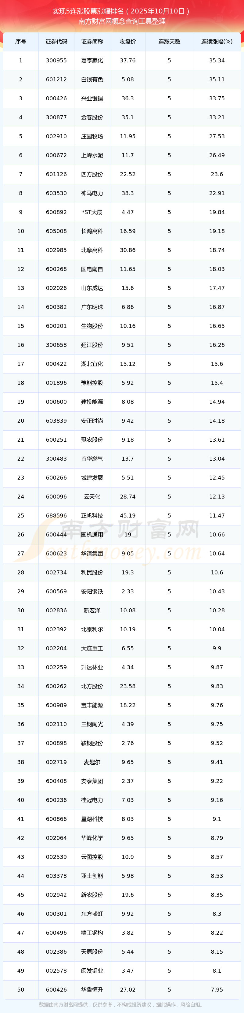 根據(jù)南方財富網(wǎng)概念查詢工具數(shù)據(jù)統(tǒng)計,截止2025年10月10日收盤,共有116只個股實現(xiàn)5天連漲。其中連續(xù)漲幅較大的個股有嘉亨家化、白銀有色、興業(yè)銀錫等,連續(xù)漲幅分別為35.34%、35.11%、33.75%。