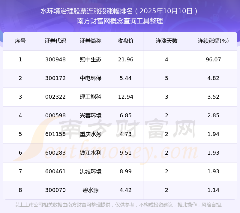 2025年10月10日水環(huán)境治理股票連漲股漲幅排名
