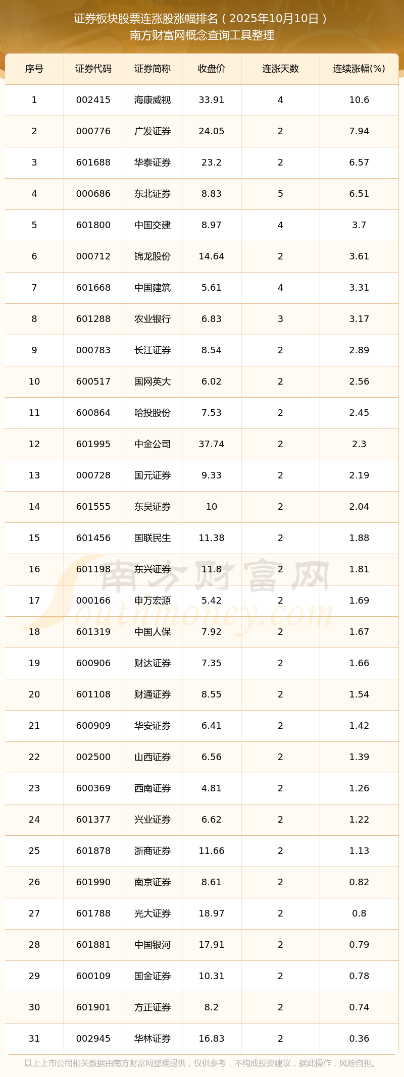 2025年10月10日證券板塊股票連漲股漲幅排名