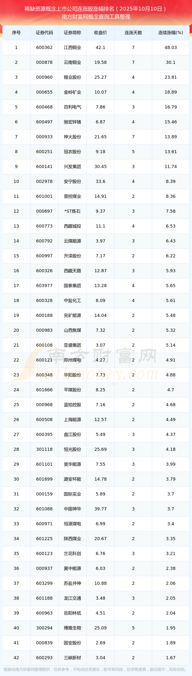 2025年10月10日稀缺資源概念上市公司連漲股漲幅排名