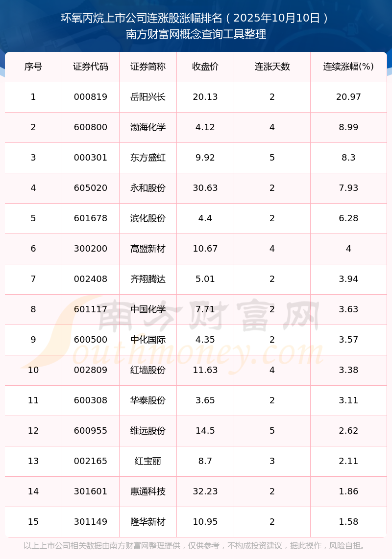 2025年10月10日環(huán)氧丙烷上市公司連漲股漲幅排名