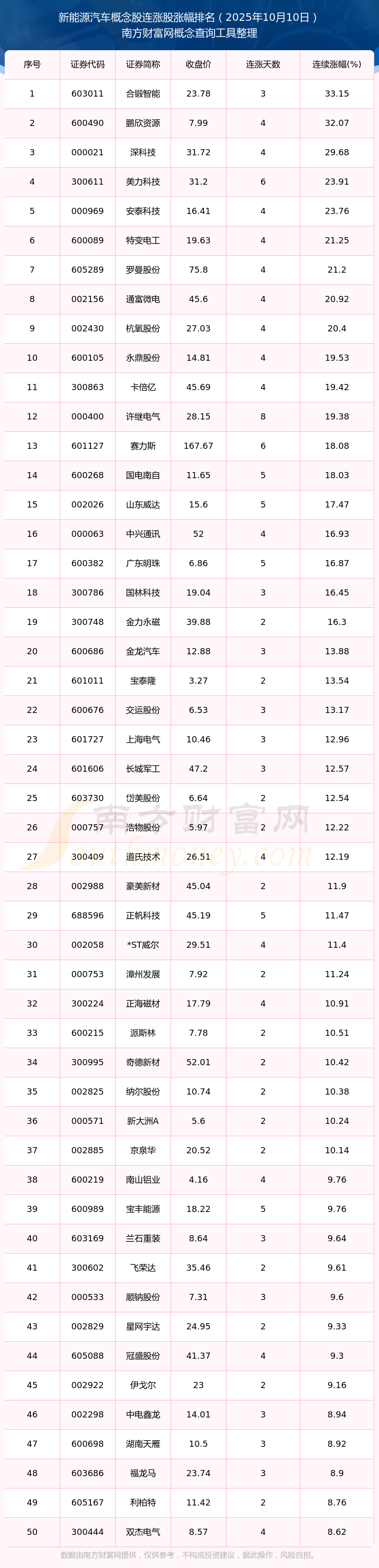 根據南方財富網概念查詢工具數據統(tǒng)計,截止2025年10月10日收盤,新能源汽車概念股共有229只個股實現連漲。其中連續(xù)漲幅較大的個股有合鍛智能、鵬欣資源、深科技等,連續(xù)漲幅分別為33.15%、32.07%、29.68%。