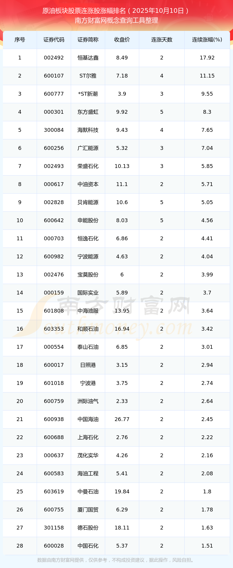 2025年10月10日原油板塊股票連漲股漲幅排名
