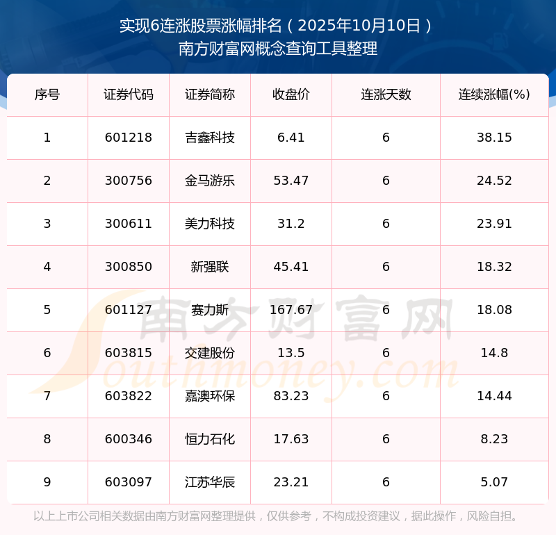 根據(jù)南方財富網(wǎng)概念查詢工具數(shù)據(jù)統(tǒng)計,截止2025年10月10日收盤,共有9只個股實現(xiàn)6天連漲。其中連續(xù)漲幅較大的個股有吉鑫科技、金馬游樂、美力科技等,連續(xù)漲幅分別為38.15%、24.52%、23.91%。