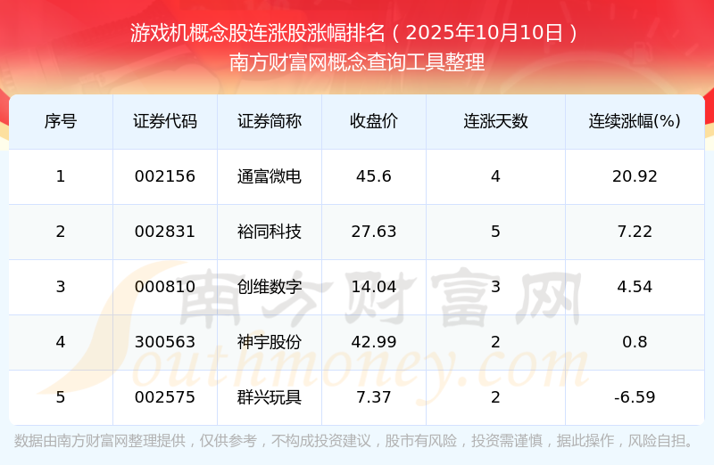 根據(jù)南方財(cái)富網(wǎng)概念查詢工具數(shù)據(jù)統(tǒng)計(jì),截止2025年10月10日收盤,游戲機(jī)概念股共有5只個(gè)股實(shí)現(xiàn)連漲。其中連續(xù)漲幅較大的個(gè)股有通富微電、裕同科技、創(chuàng)維數(shù)字等,連續(xù)漲幅分別為20.92%、7.22%、4.54%。