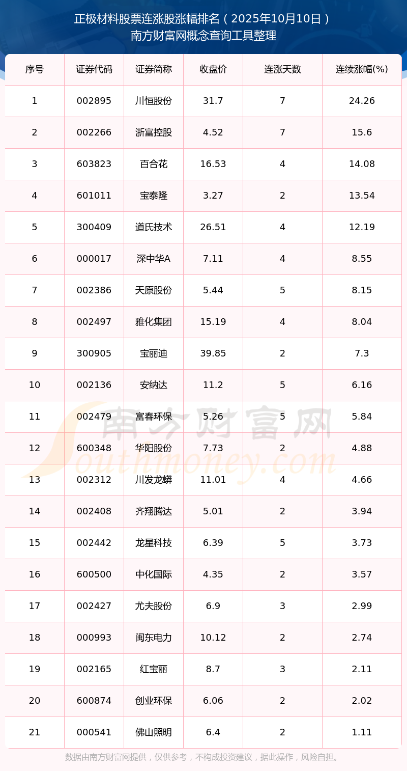 2025年10月10日正極材料股票連漲股漲幅排名