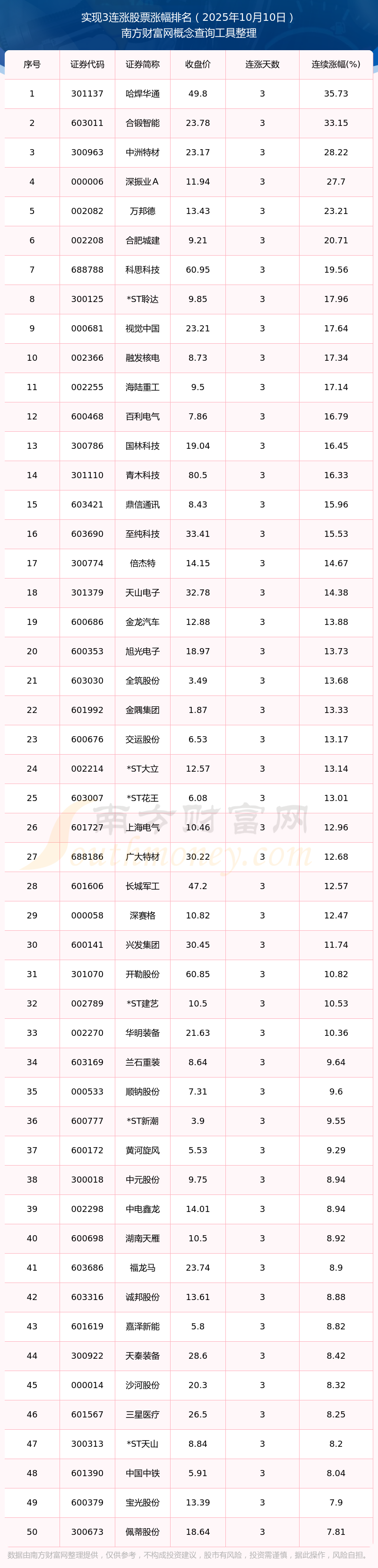 2025年10月10日實(shí)現(xiàn)3連漲股票漲幅排名