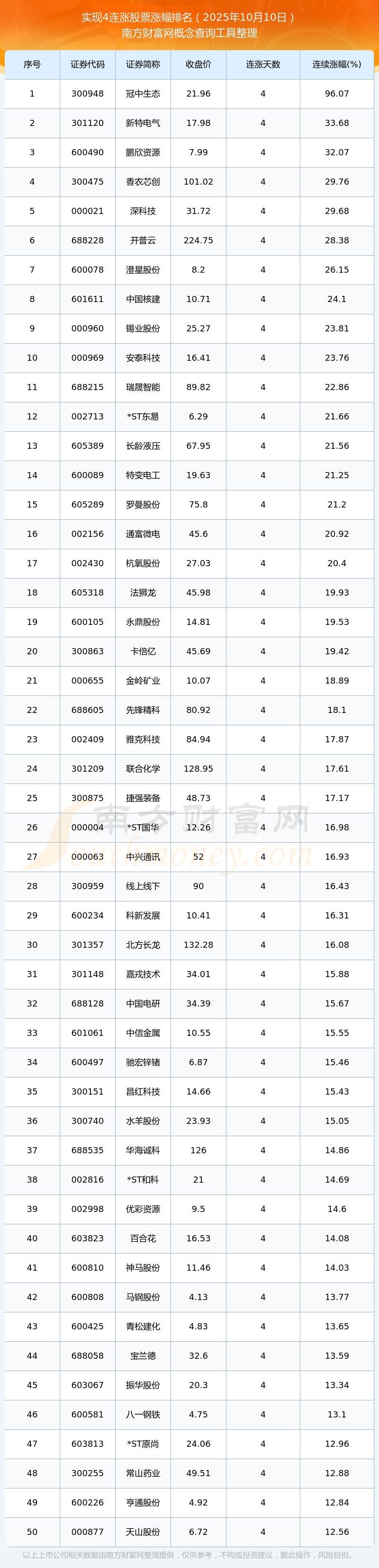 2025年10月10日實現(xiàn)4連漲股票漲幅排名