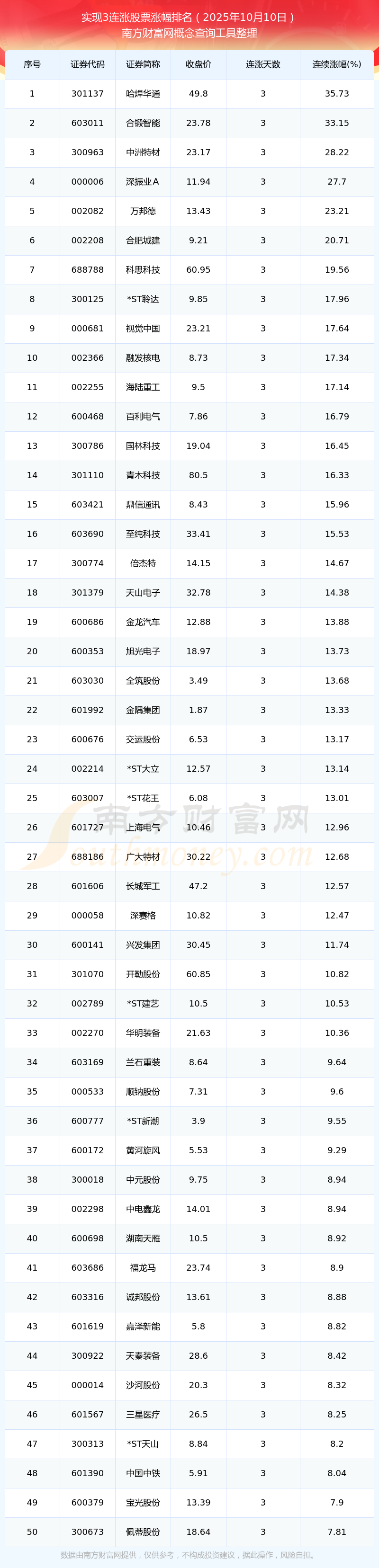 2025年10月10日實現(xiàn)3連漲股票漲幅排名