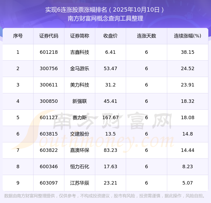 根據(jù)南方財富網(wǎng)概念查詢工具數(shù)據(jù)統(tǒng)計,截止2025年10月10日收盤,共有9只個股實現(xiàn)6天連漲。其中連續(xù)漲幅較大的個股有吉鑫科技、金馬游樂、美力科技等,連續(xù)漲幅分別為38.15%、24.52%、23.91%。